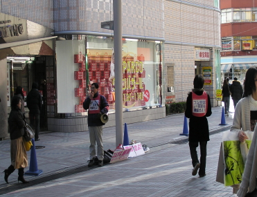 最高気温9度、ビル風が渦を巻く中、熱いマイクアピールとビラの弾丸をうちまくり