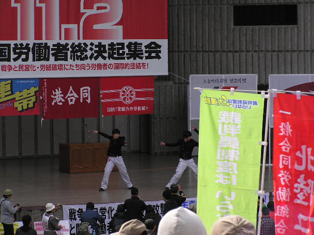いよいよ開会です!前段集会を終えた学生も集まってきました。 法政の「文化連盟」の幟旗もみえますよ~♪