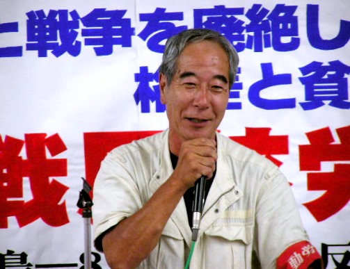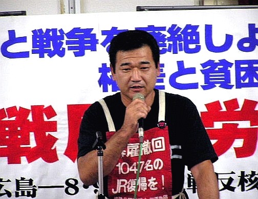 国労5・27臨大闘争弾圧被告の羽廣憲さん(国労小倉地区闘争団)は8・5-8・6広島を闘い抜き、長崎の8・8被爆63周年長崎反戦反核労働者集会でも理路整然とかつ熱烈なアピール。