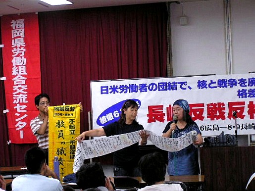 「私はここ長崎への原爆投下を想起するだけでなく、核と戦争に反対して団結する多くの労働者の一人として、ここでみなさんと手をつなぐことがでるのをとても光栄に思います。世界中で巨大な民衆が連帯して、変革が創りだされています。それには分断を乗り越える公民権運動、労働運動などの様々な運動、そして国鉄の民営化と闘ってきた動労千葉の23年間の闘いが必要でした。