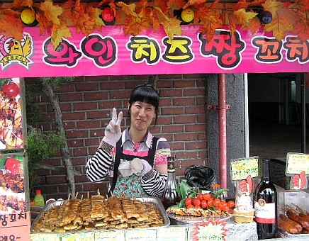 釜山の国際通り付近の屋台のおねえさん。むっちゃ甘辛いいBBQ?でした!