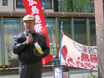 この時季にはめずらしい「寒の戻り」で、肌寒いビル風が吹きすさぶ中、広島連帯ユニオンの労働者、高陽第一診療所労組とともに、核戦争とチェルノブイリ事故再現の危機を激しく促進するオバマの核政策、「道州制」「労組破壊」の階級戦争と海外への侵略戦争に突き進む日帝・麻生と真っ向から対決するものとして、意気高く闘い抜いた。