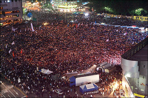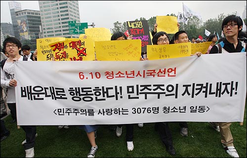 6・10民主抗争22周年にあたる10日、ソウル市庁前ソウル広場で開かれた 「6月抗争継承・民主回復のための汎国民大会」に、10万余の労働者・学生・高校生・市民が、イ・ミョンバクの集会不許可攻撃を実力強行で打ち破り結集した。