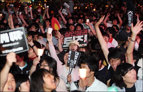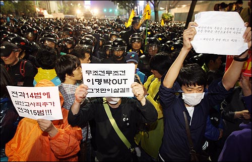 「イ・ミョンバクOUT!」と同時に「ユ・インチョンOUT!」のシュプレヒコール。