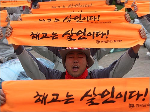 「解雇は殺人だ!」と書かれたスローガン(双龍自動車労働者)