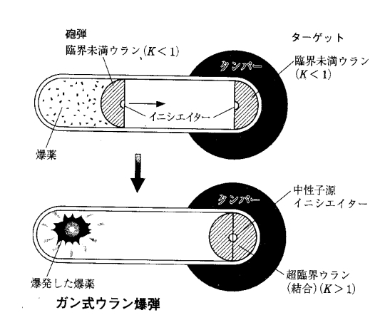 一方の臨界未満の塊の中に中性子を放出する装置(イニシエイター)を備え、1つの塊(ターゲット)を一方の端に固定し、もう一方(砲弾)をターゲットめがけてぶつける。