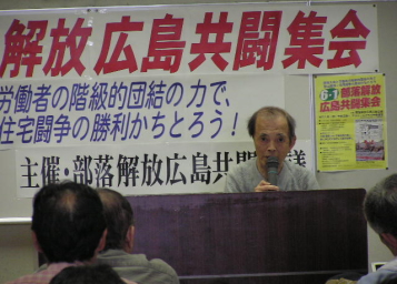 集会のあいさつの最初に、反戦被爆者の会 会長大槻泰生さんが怒りをこめて「労働者階級を分断しようと敵階級は必死に攻撃をかけてきています。部落民と労働者、被爆者をバラバラにしないと戦争に突き進めないからです。私たちはバラバラにされてはいけないのです。」と熱いアピール。