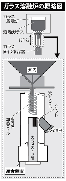 温度の低下でガラスの粘性が高まり、ガラス固化体容器にまっすぐ流下しにくくなった。