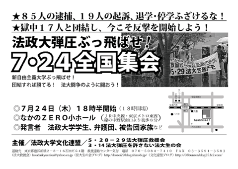 日本階級闘争の扉をこじ開けた6・29渋谷大デモ、その突撃路となった現代の「10・8」法政大学5・28ー29決起を完黙・非転向かつ意気揚揚と闘い抜いている学生たちが、「法大弾圧ぶっ飛ばせ!7・24集会」(なかのZERO小ホール)を呼びかけている。