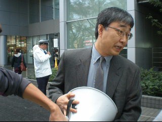 その日は、新井君・中島君が法大正門前に登場すると、市ヶ谷学生センター長・木原を先頭に警備員と職員が殺到し、トラメガのコードを引きちぎって破壊しました。法大生の会のブログに、当日の写真があります。↓http://hosei29.blog.shinobi.jp/Date/200804/3/ (ページの真中あたりです)