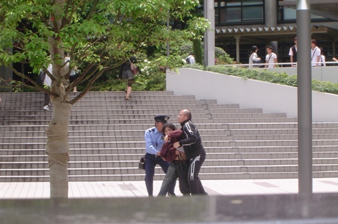 中島敦史君は9月29日、自分の公判が終わった時、傍聴に来た仲間にあいさつしようと後ろを振り向きました。すると両脇にいた東京拘置所の職員数人が中島君につかみかかり、両手両足を持って法廷の外に連れ出し、エレベーターに押し込んだのです。頭部を廊下に押しつけられ、手首に赤い腫れが残るほど手錠を締めつけられました。