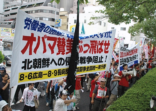 オバマ演説を賛美する日本共産党、連合、広島市長・秋葉忠利、被団協をぶっ飛ばし、麻生とオバマを打倒しよう。被青同はその先頭に立ちます。