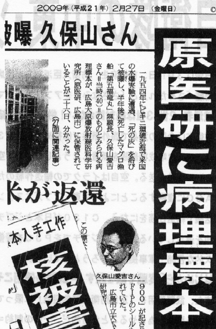 中国新聞夕刊(2月23日付)の記事の、「久保山さんは、原水爆の被害者はわたしを最後にしてほしいといい残して亡くなった」なる記述は、まったくデタラメの作られた美談だ。