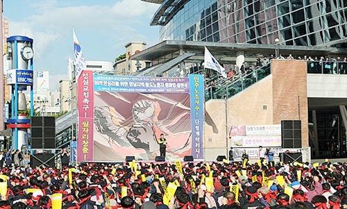 午後2時、釜山駅広場で開かれたヨンナム地域鉄道労組ストライキ出征式には、釜山・大邱・馬山などの釜山地方本部所属2,500人の組合員らの集結を実現した。